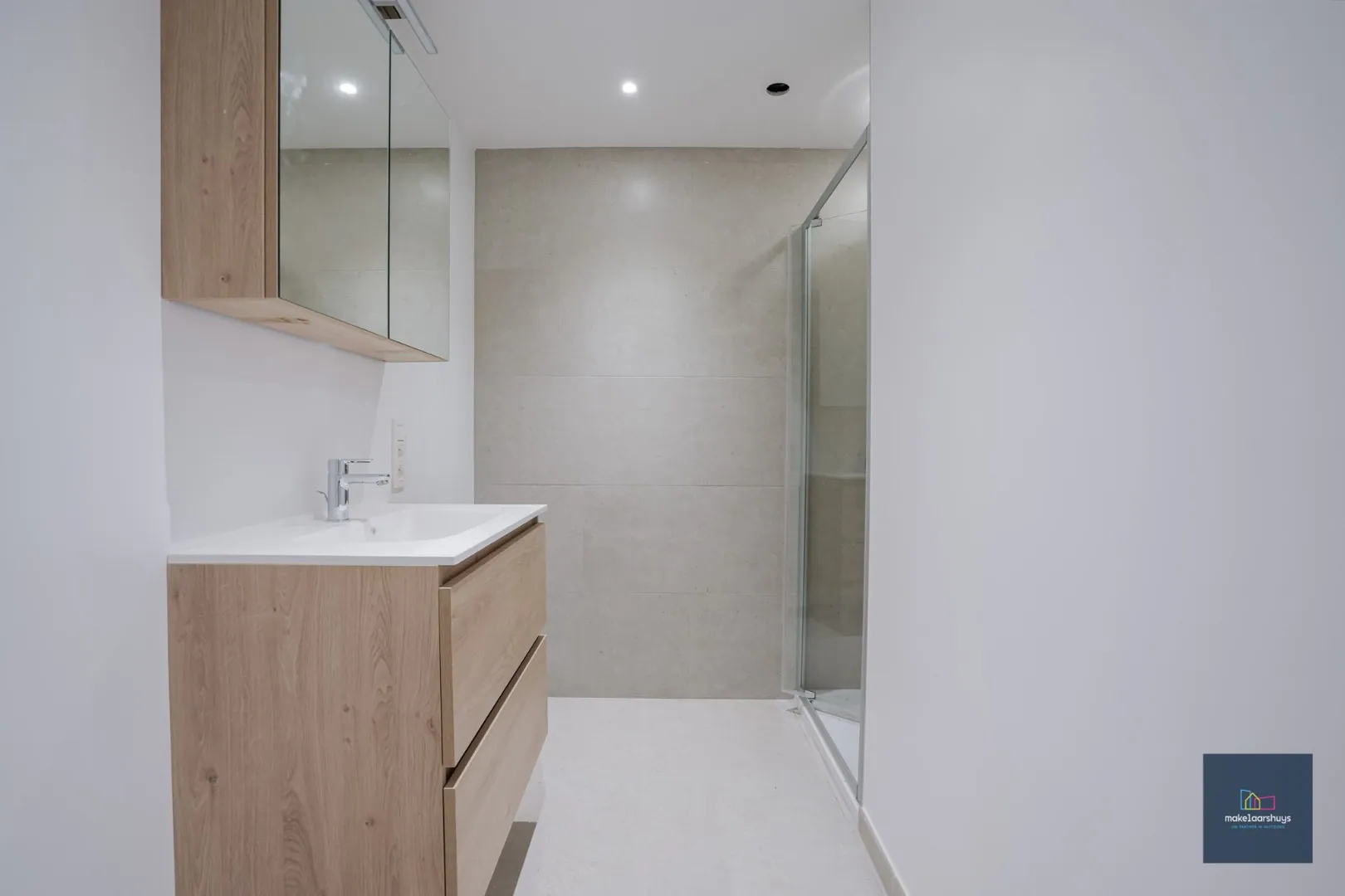 De badkamer is modern en beschikt over een wastafel en een inloopdouche en ruimte voor wasmachine/droogkast.