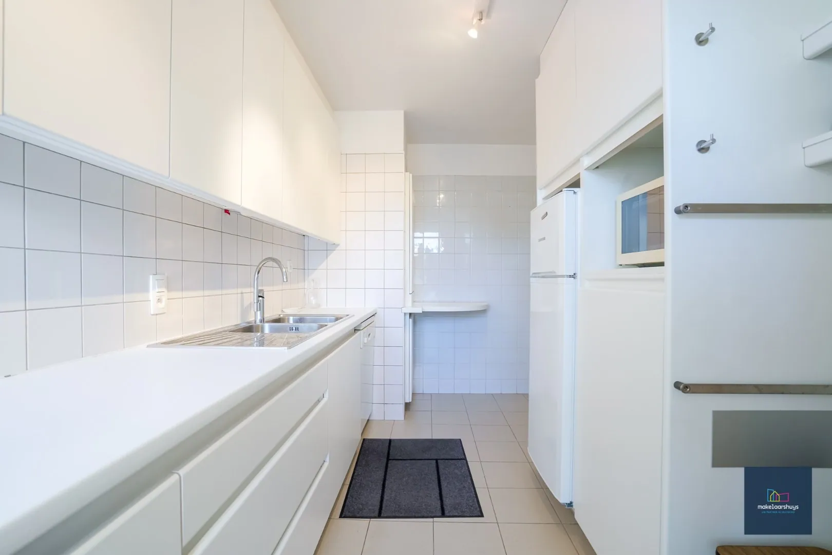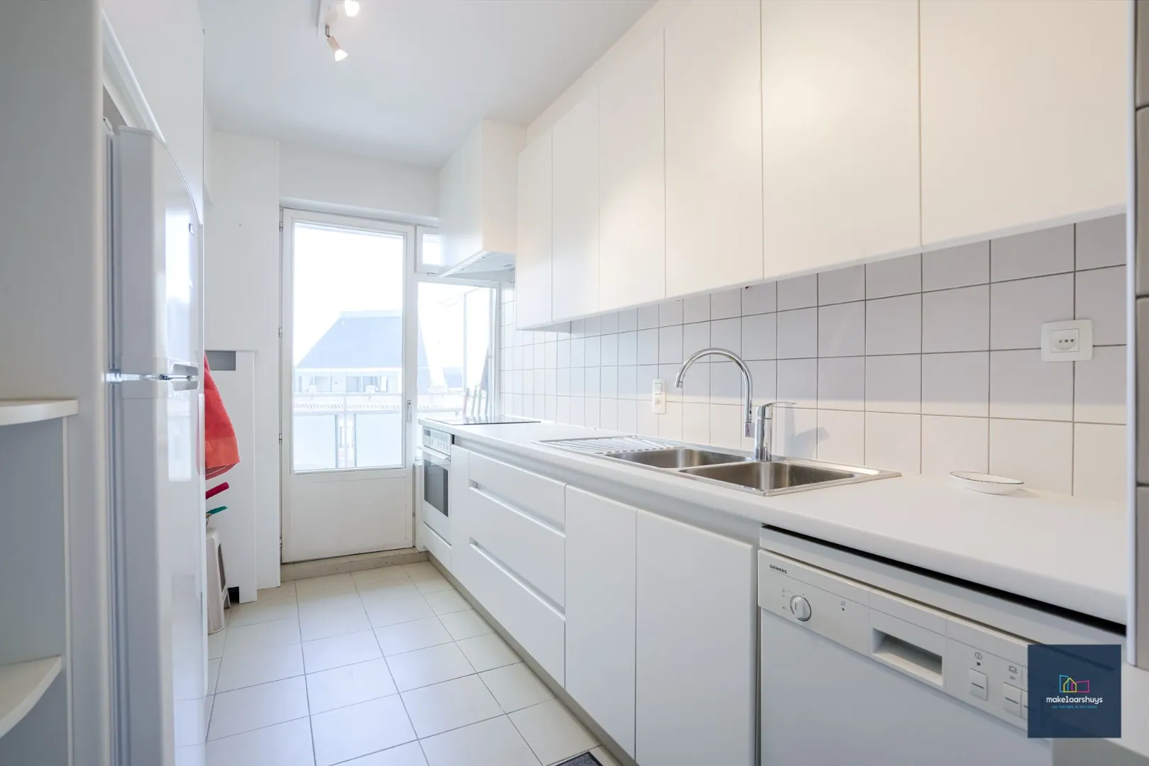 De keuken is voorzien van toestellen, voldoende opbergkasten en toegang tot een klein terrasje, handig voor de vuilbakken.