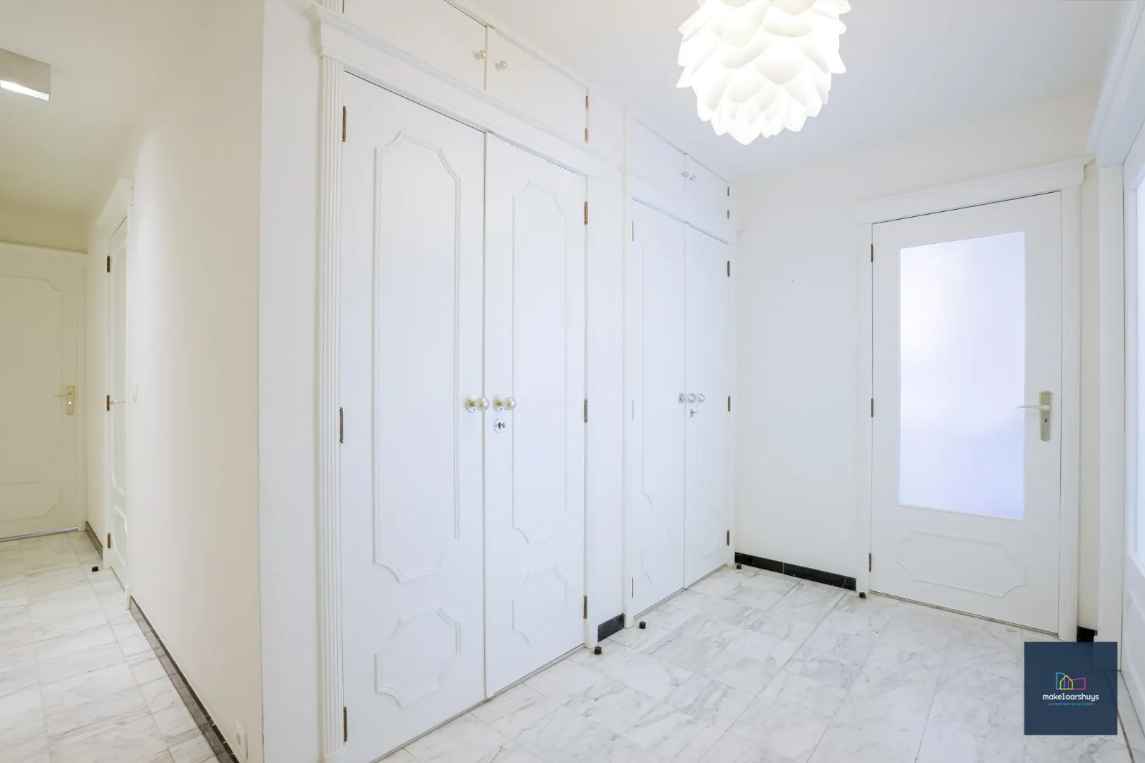 We komen binnen in de inkomhal met vestiairekasten. Vanuit de inkom is er toegang tot de ruime lichtrijke leefruimte met prachtig zicht op het Citadelpark.