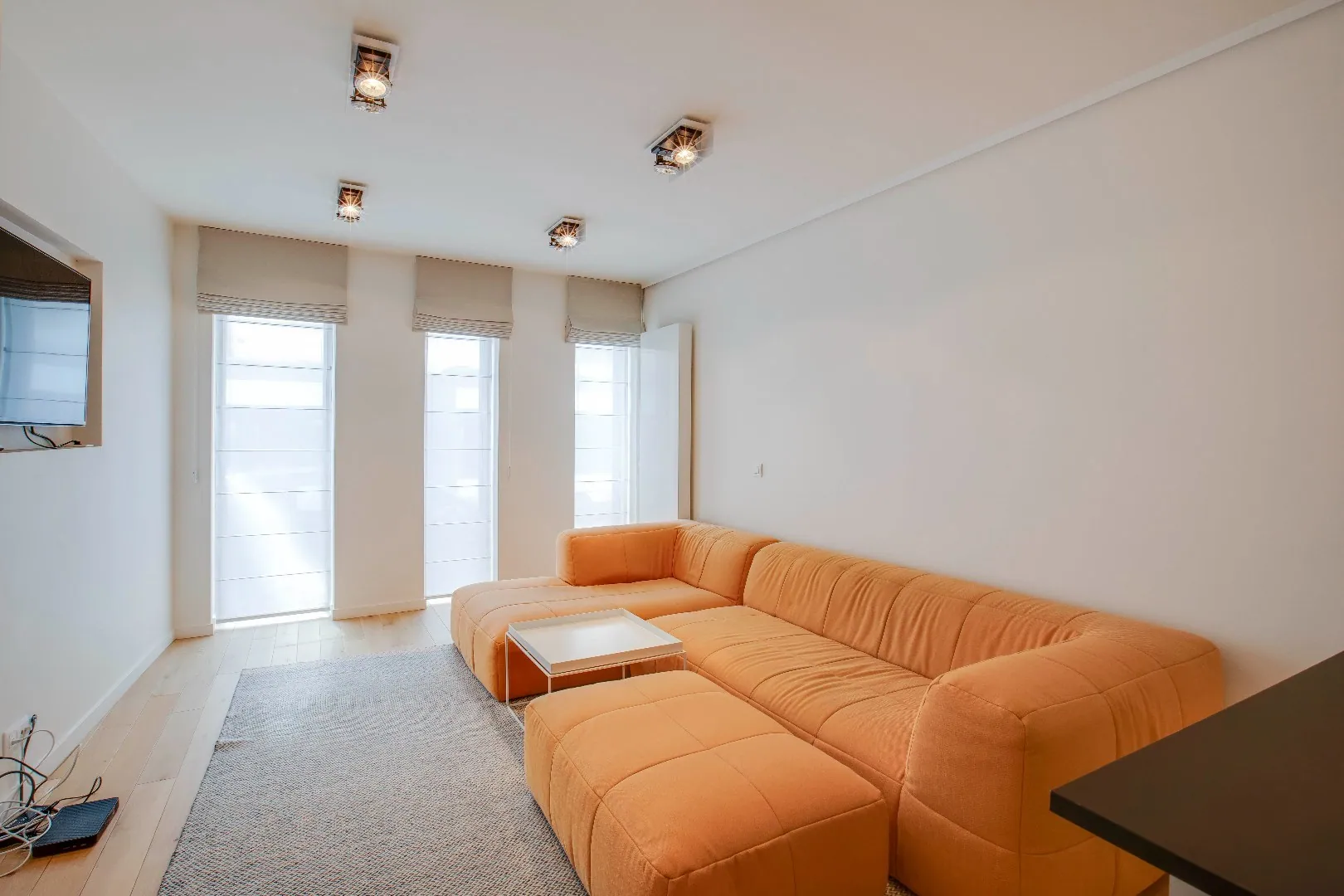 Er is een stijlvolle zithoek ( hd kabel) - - ingebouwde samsung tv met reeds aanwezige zetel en sfeervolle verlichting en inbouwspots. Parket met tapijt en keramische tegel.