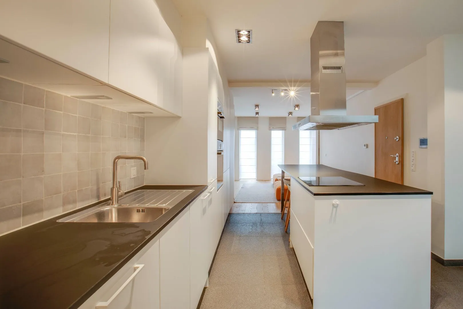 Het appartement omvat 75 m² en is verdeeld over een moderne leefruimte met kwalitatieve open keuken met kookeiland ( composiet) en recente toestellen( koelkast , vaatwas, oven, microgolf, inductiekookplaat, wasmachine, …. inbouwkasten . U kan eten aan het keukenblad.