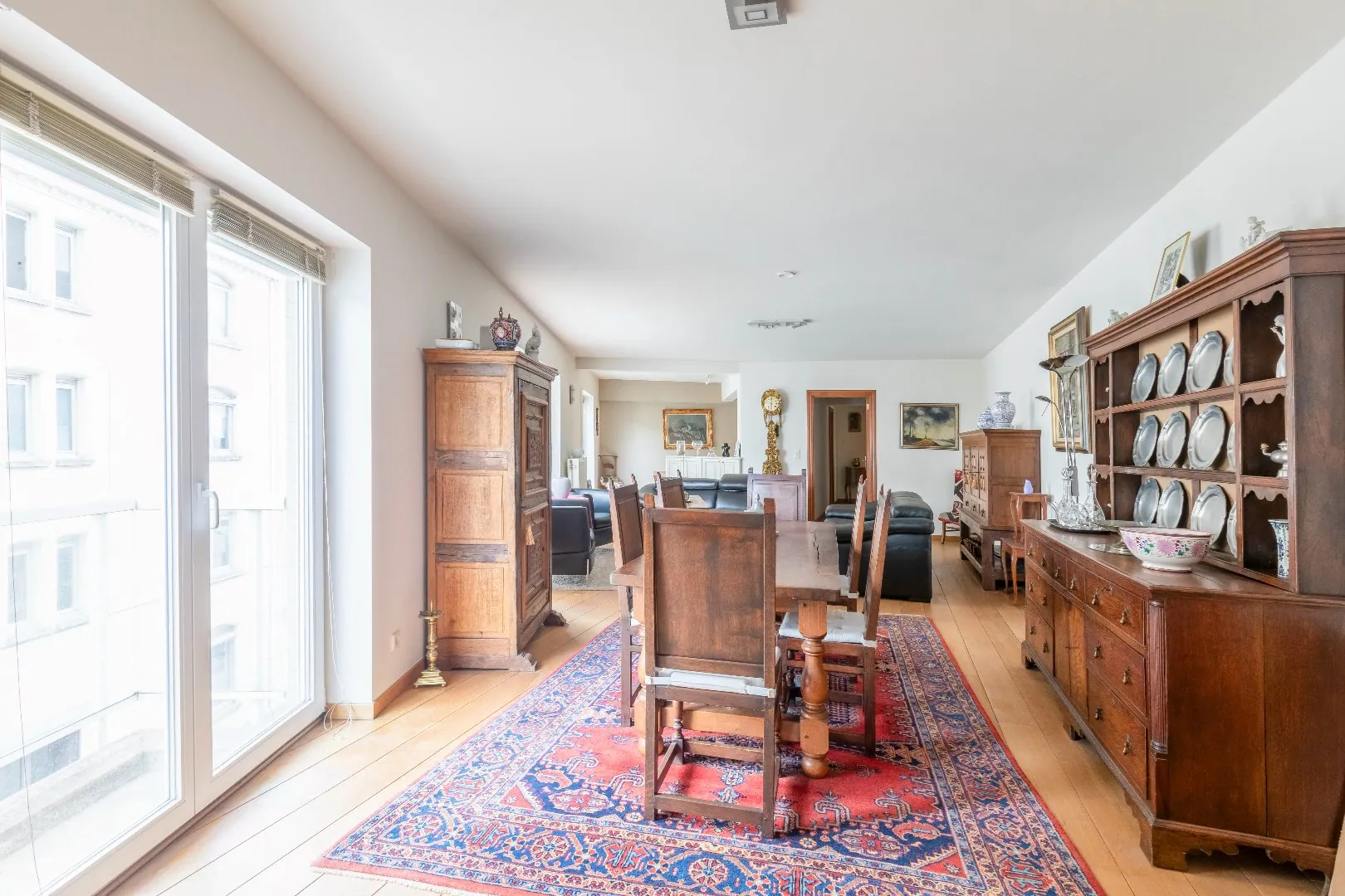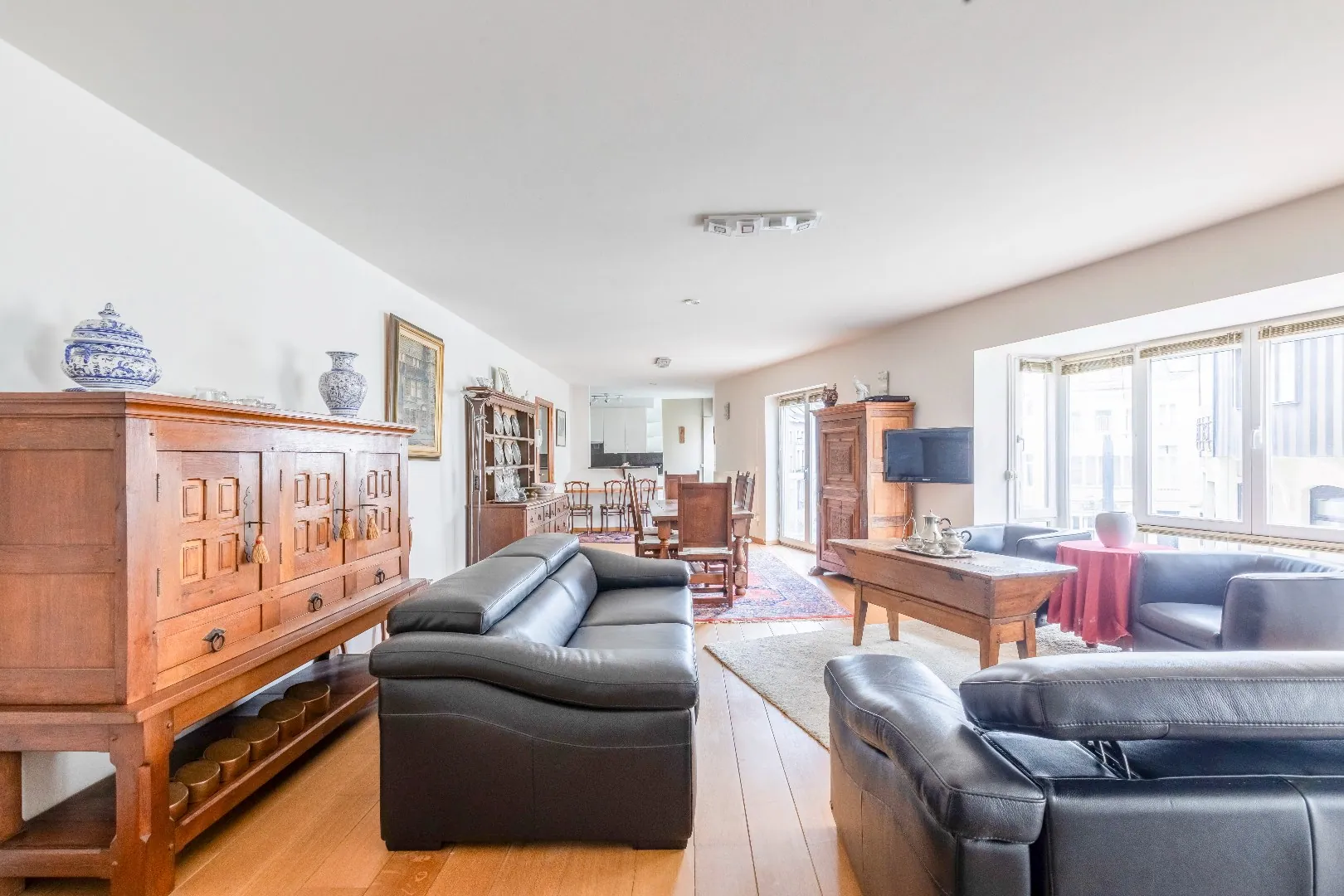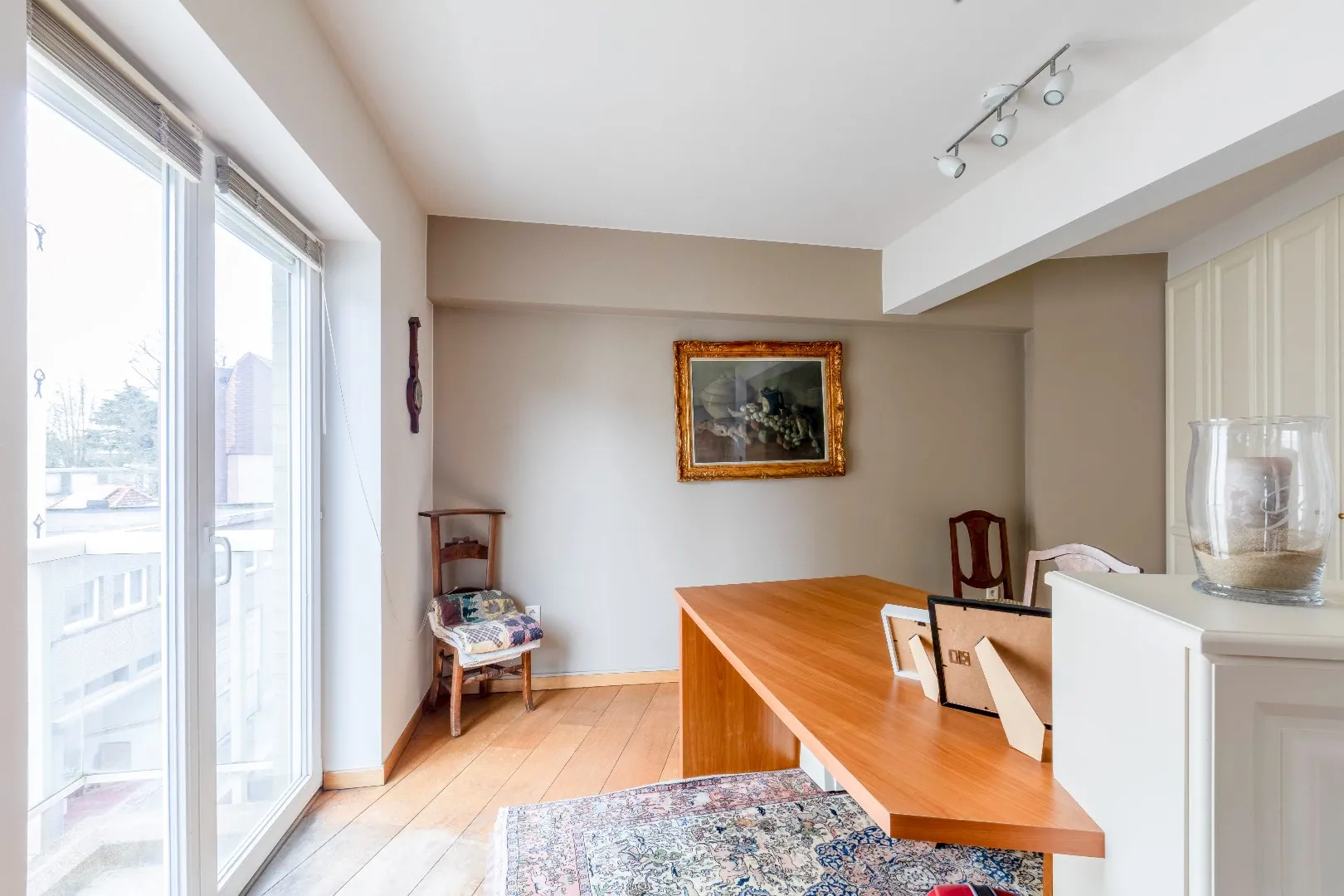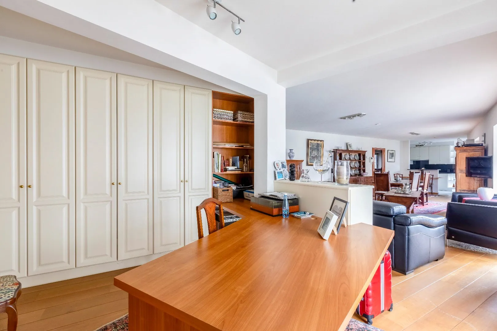 Via een tussendeur bereikt u de ruime en lichtrijke living die voorzien is van zit-en eethoek en de mooie bureauruimte met ingemaakte kasten. Met toegang tot 2 leuke terrasjes.