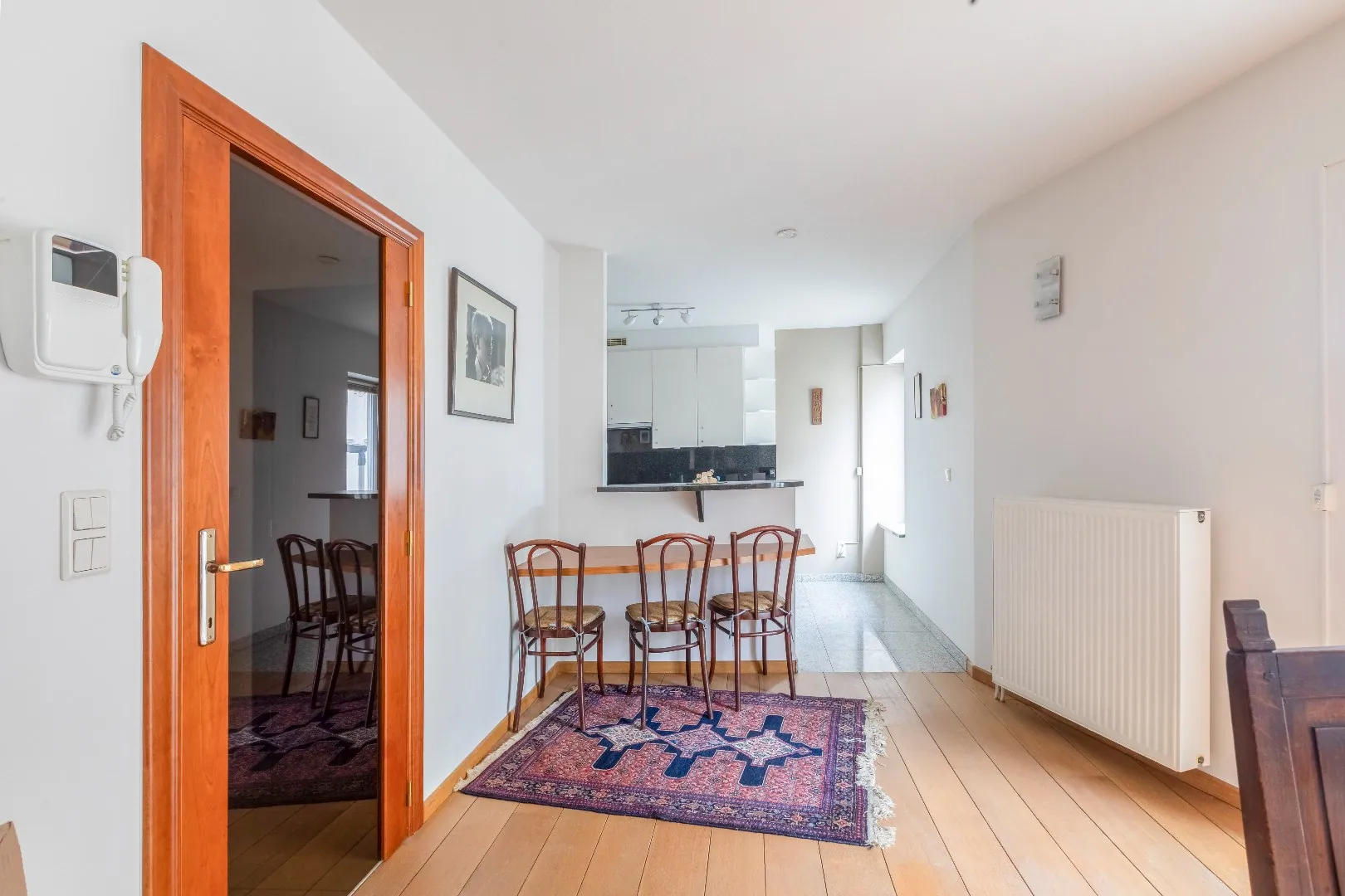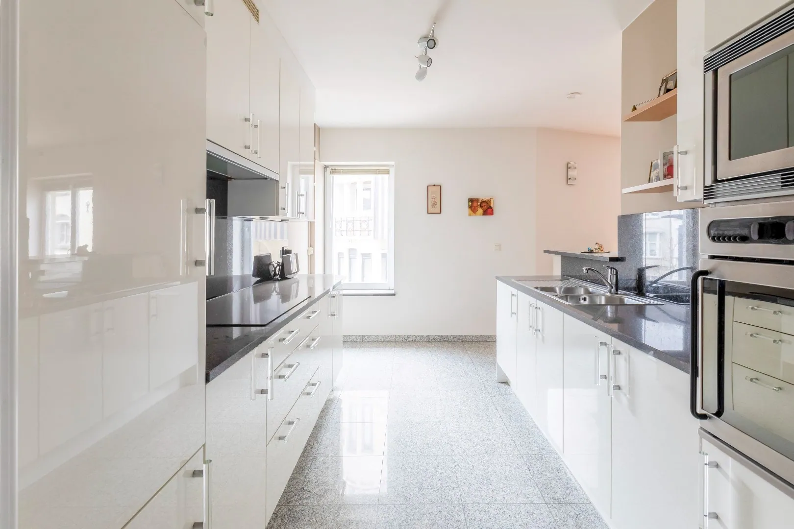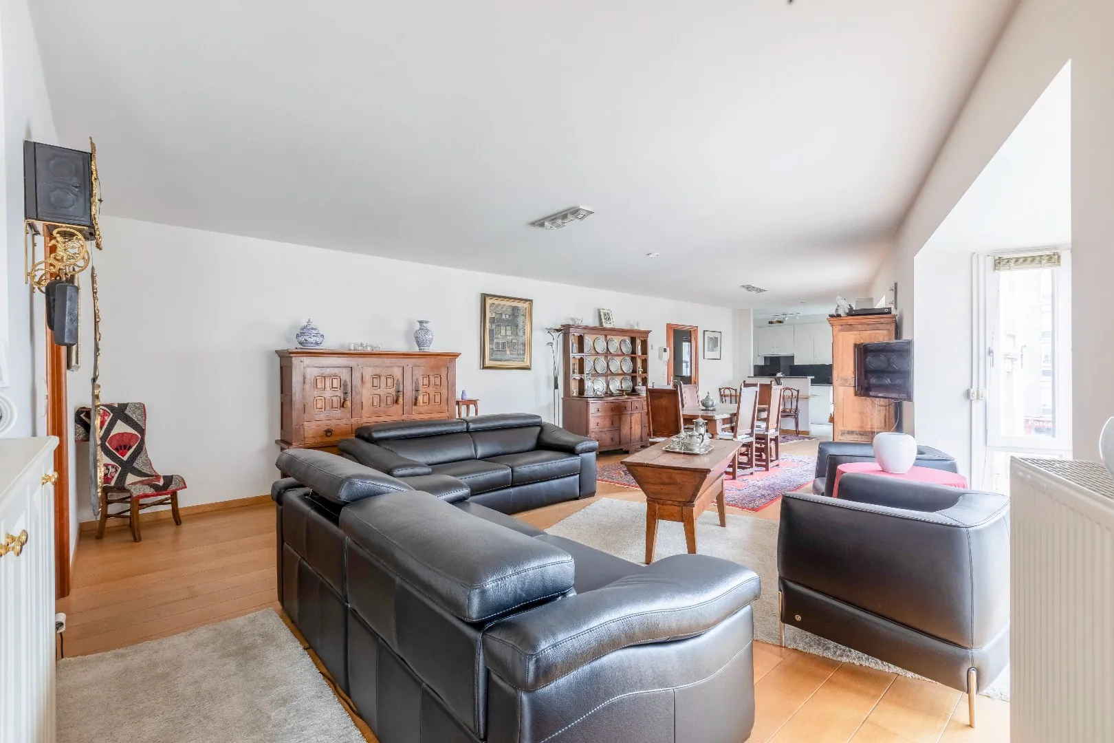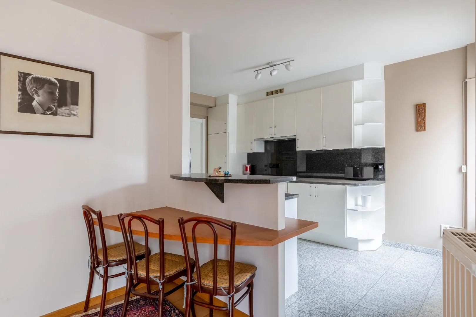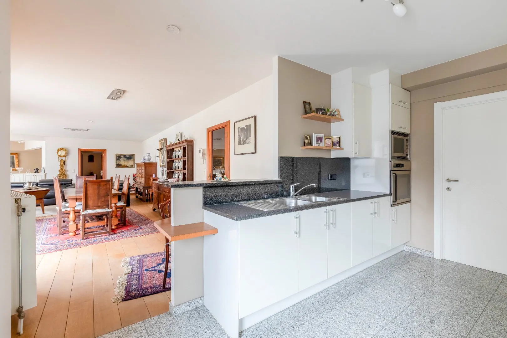 De kwalitatieve keuken is open en is voorzien van alle toestellen Atag.( vaatwas, inductiekookplaat, ijskast, vriesvak, microgolf, oven, ...) en voldoende opbergkasten, eethoek.
