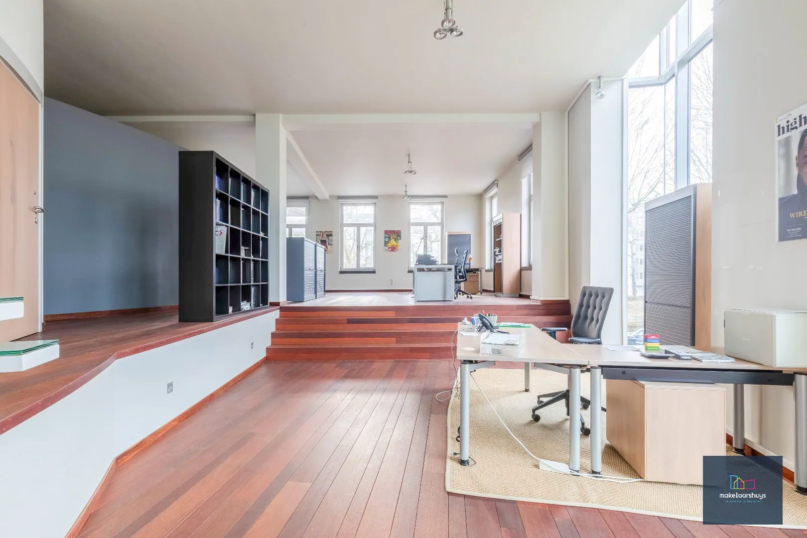De grote raampartijen zorgen voor veel natuurlijke lichtinval en de parketbevloering straalt warmte en kwaliteit uit. Het kantoor is voorzien van spots, wandverlichting, gordijnroedes, contactdozen met afdekkap, ...