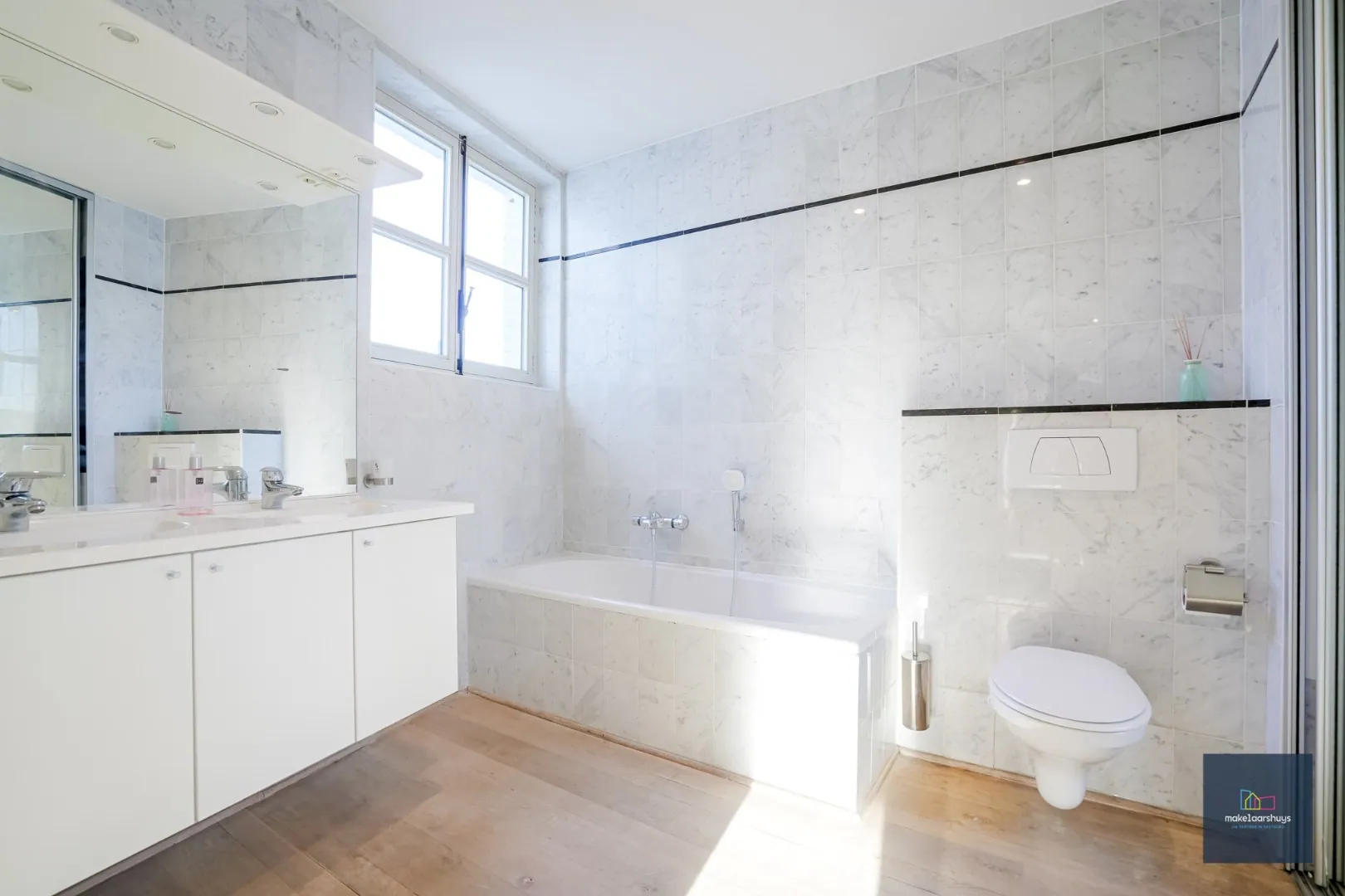 Er is een badkamer met een ligbad, douche, toilet, een dubbele wastafel, opbergruimte en een aparte wasberging voor wasmachine en aparte berging.