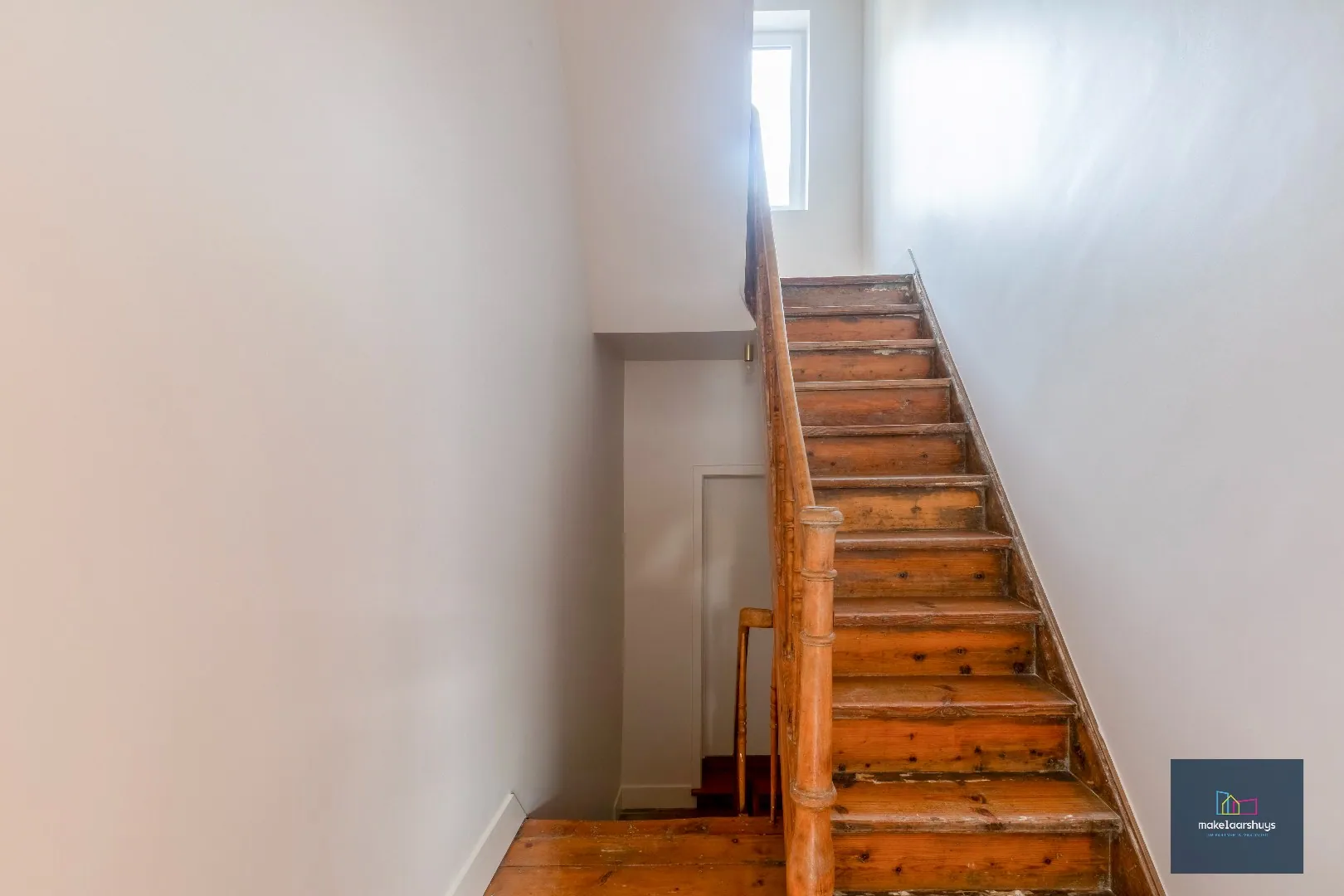 Er is een algemene inkomhal, via de houten trap bereikt u de 1ste verdieping met een ruime en lichtrijke woonkamer .