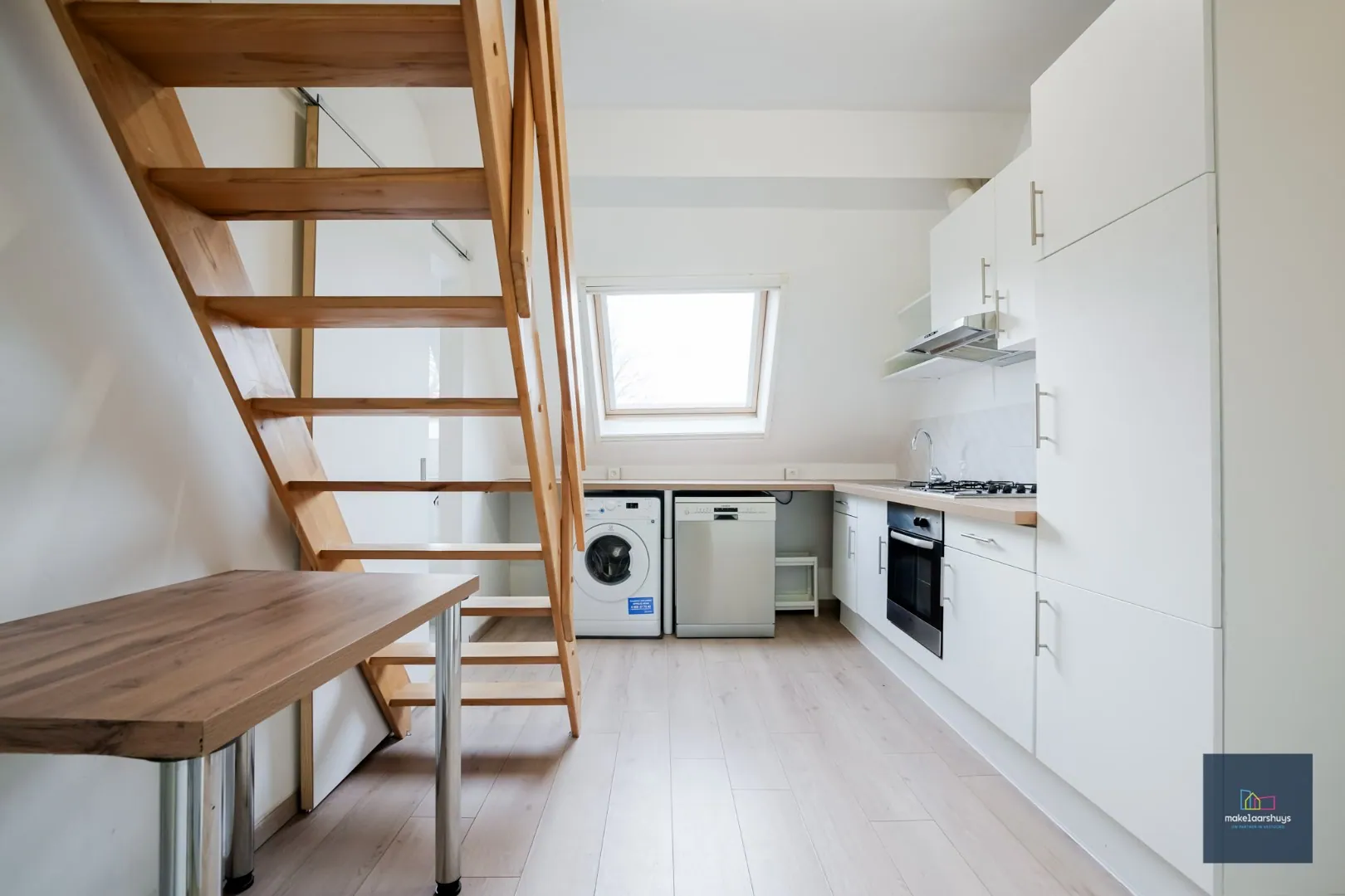 De recente en verzorgde keuken met toestellen deze is voorzien van een kwalitatief gasvuur, een oven, een vaatwasser, een wasmachine en heeft voldoende opbergkasten.