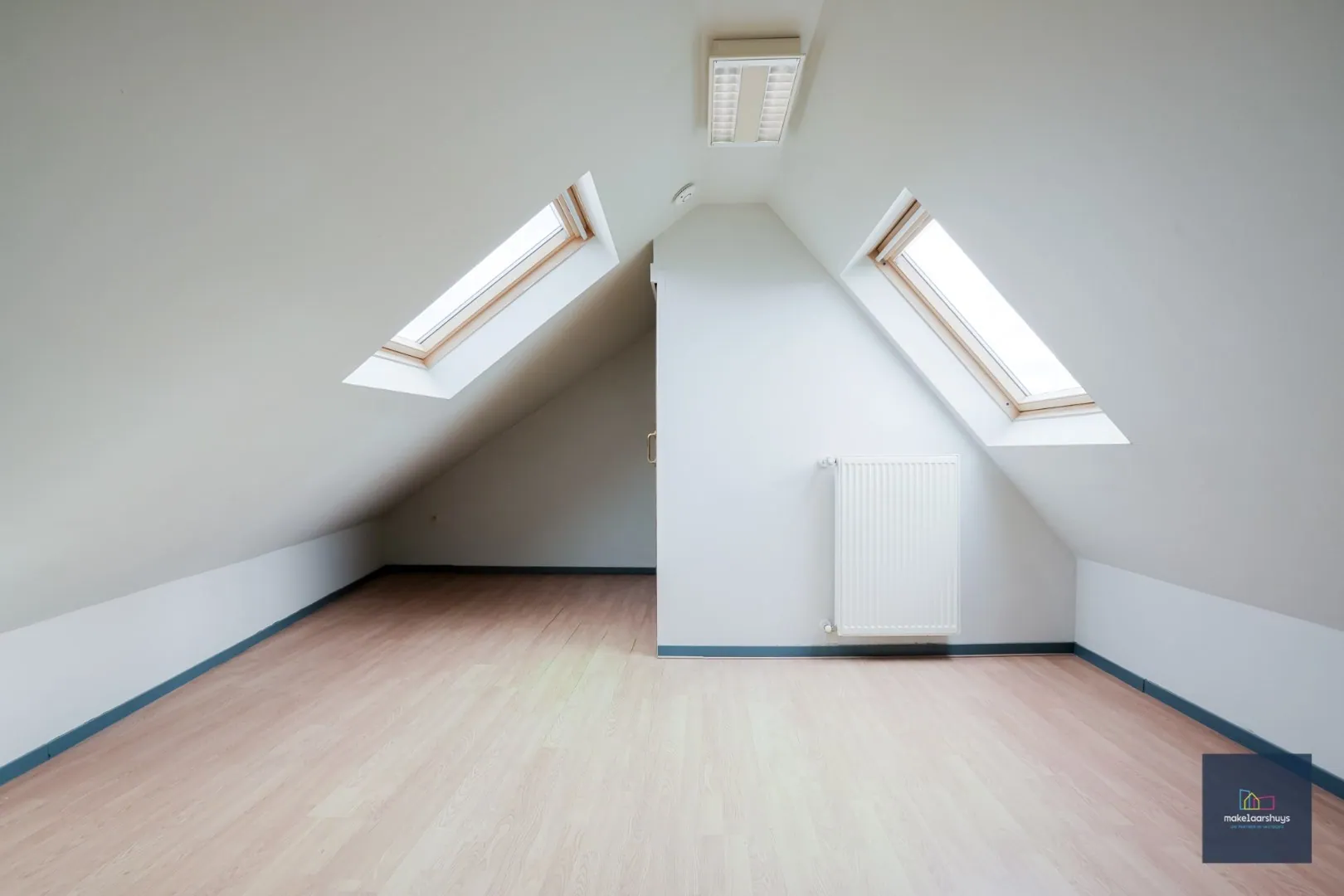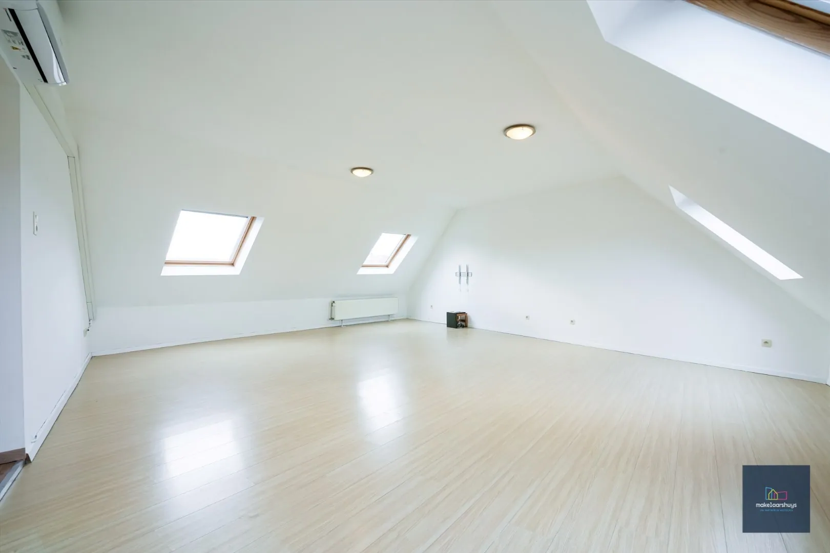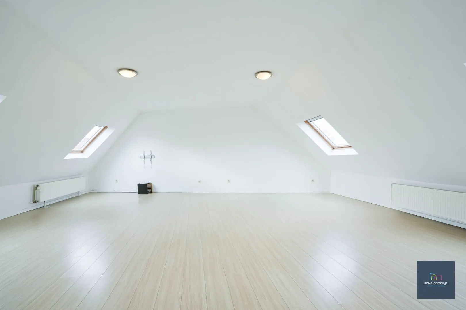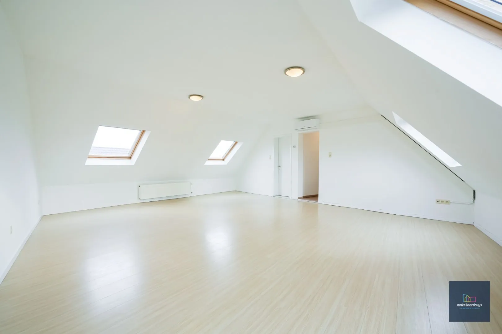 Inkomhal, parlofoon, er is een zeer ruime leefruimte voor een eethoek, een zithoek en een bureauhoek . Er is een aangename natuurlijk lichtinval door de 4 veluxen.