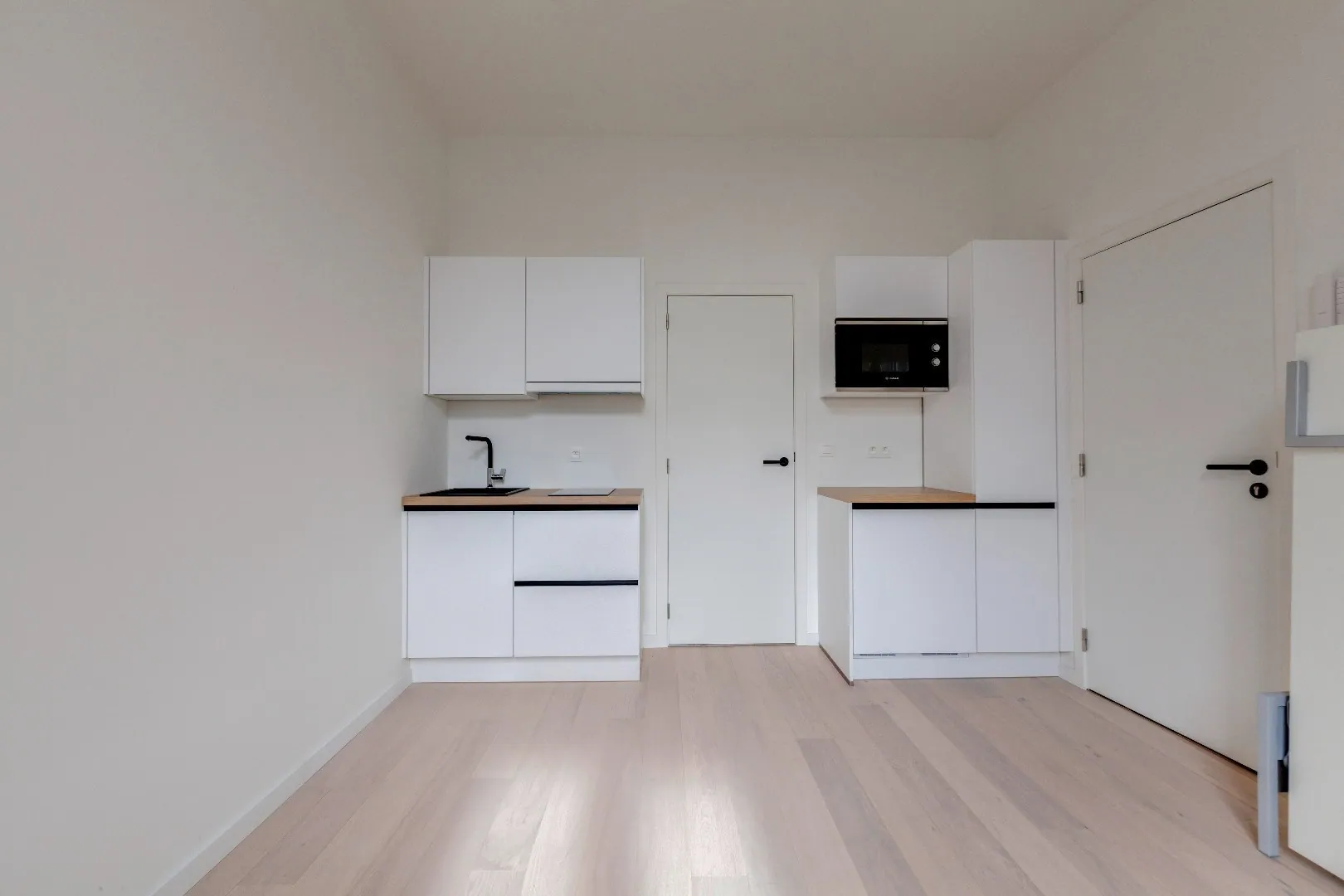De studio's zijn voorzien van een eigen keuken met toestellen, een leefruimte met eethoek en een slaaphoek ( bevloering parket) , aparte badkamer met douche, wastafel en toilet.