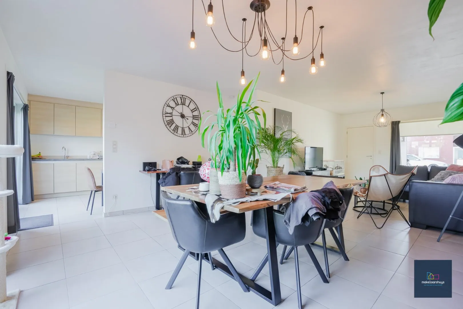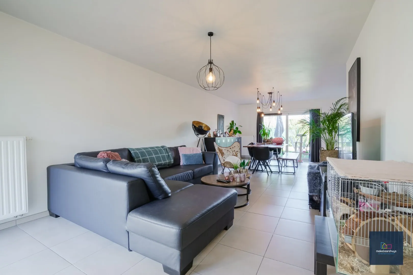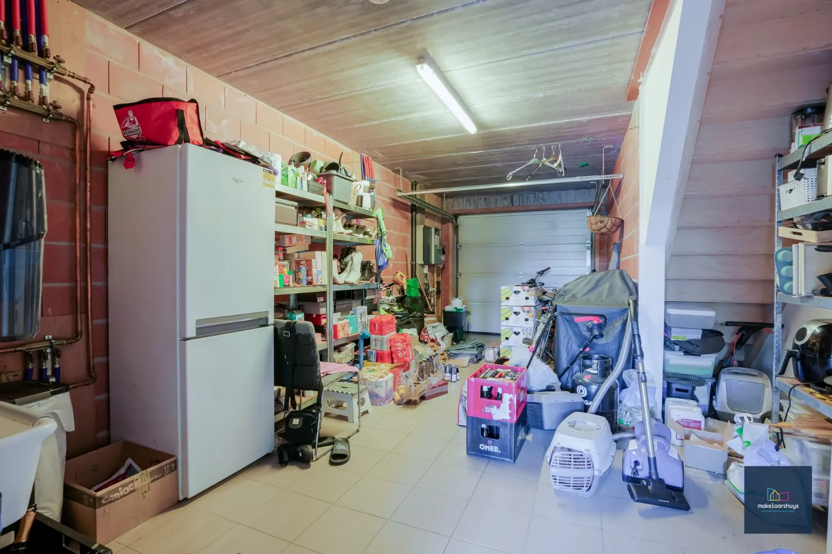 Verder komen we in de lichtrijke leefruimte en de ruime keuken ingericht met toestellen. Aansluitend kunnen we de bergruimte en garage vinden. De tuin kunnen we bereiken via de schuiframen in de leefruimte en de keuken.