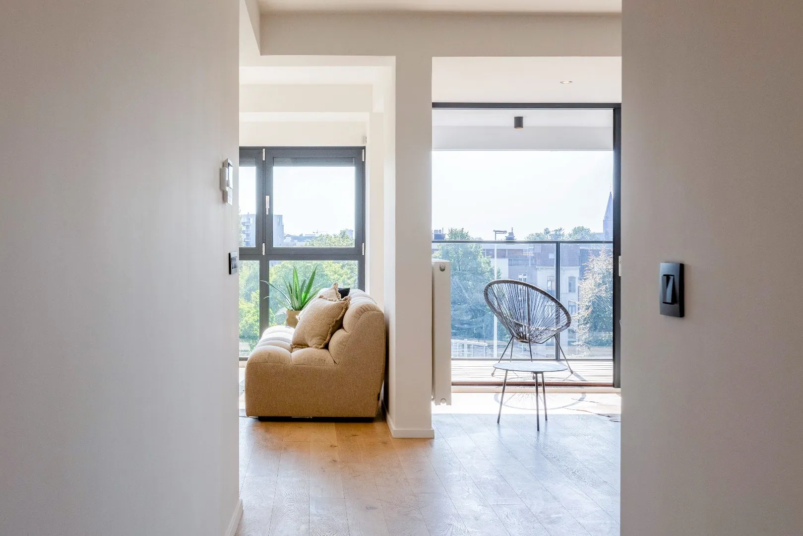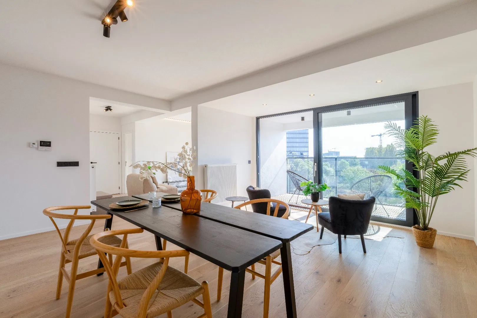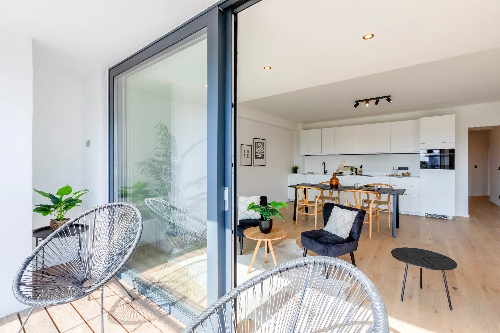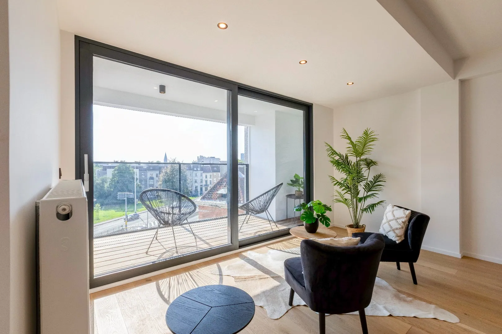 Het volledige appartement is uitgerust zwarte spots van Philips. en heeft een mooi overdekt terras met uitzicht dat men kan bereiken via het schuifraam van de leefruimte.