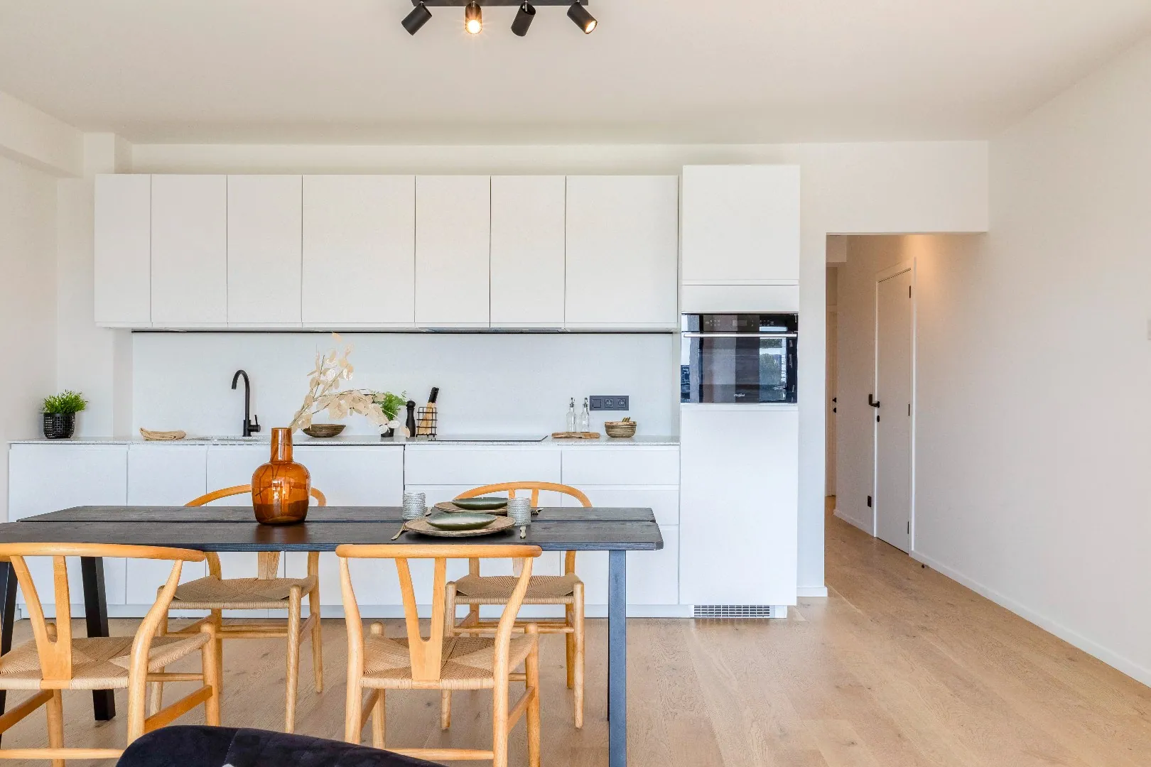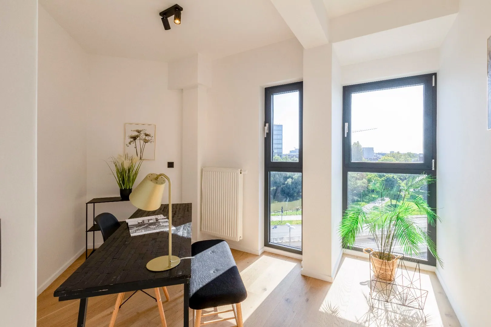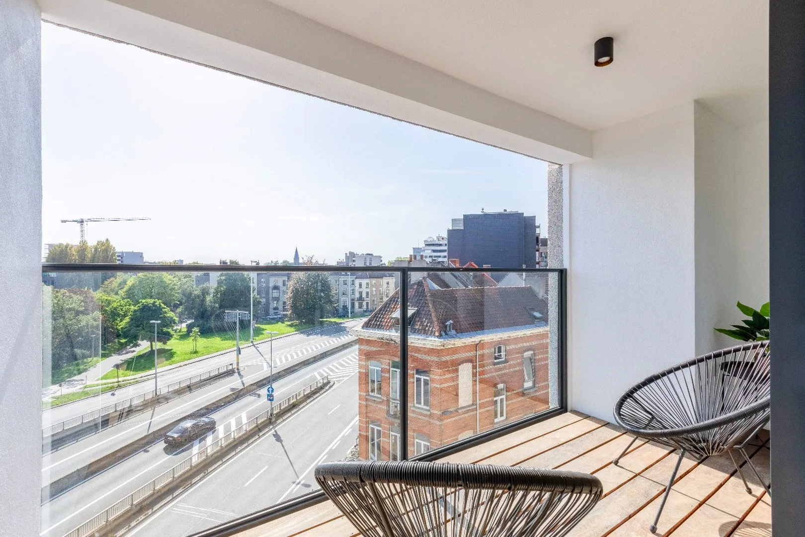 Het volledige appartement is uitgerust zwarte spots van Philips. en heeft een mooi overdekt terras met uitzicht dat men kan bereiken via het schuifraam van de leefruimte.