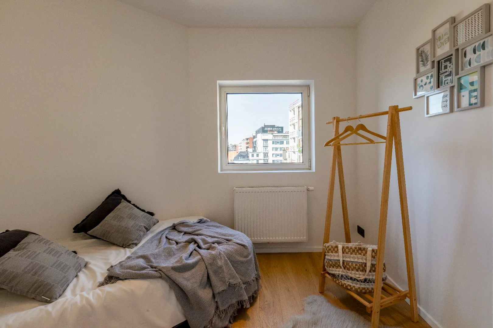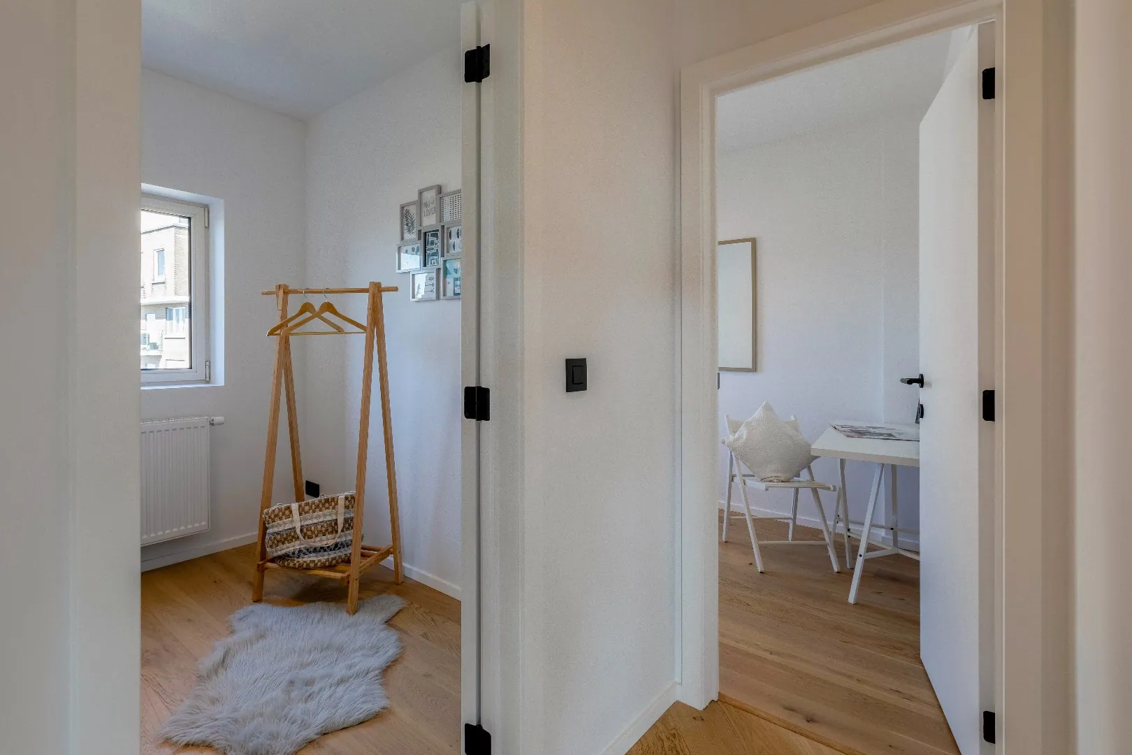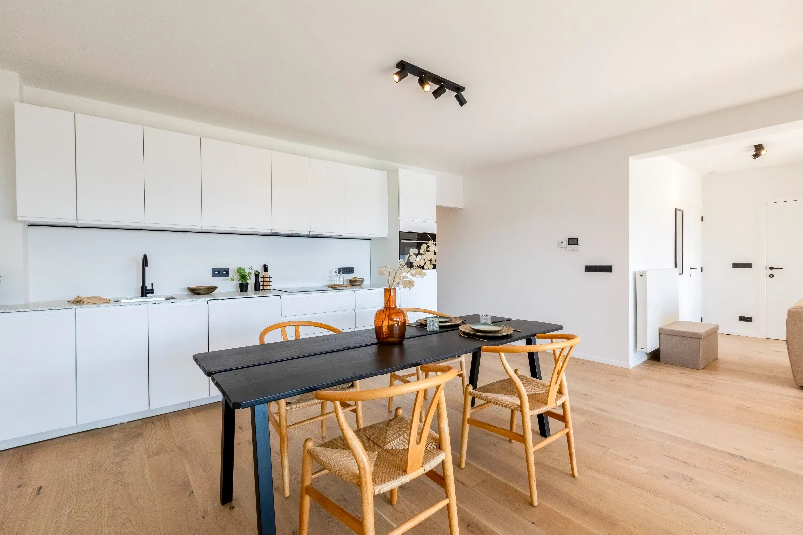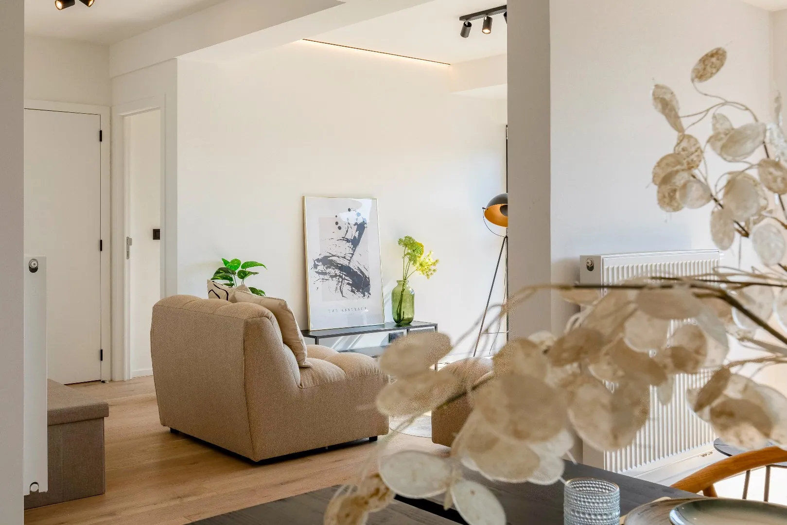 Het volledige appartement is uitgerust zwarte spots van Philips. en heeft een mooi overdekt terras met uitzicht dat men kan bereiken via het schuifraam van de leefruimte.