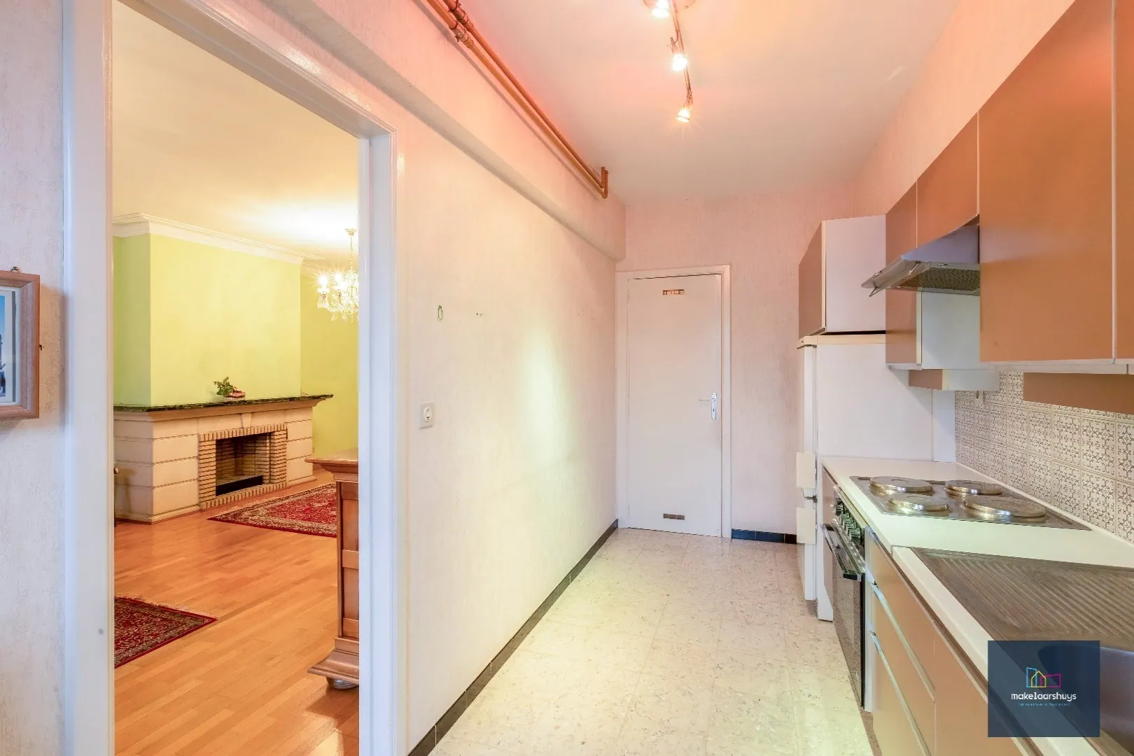 Dit goed gelegen en ruim appartement is gelegen op de 4de verdieping. Binnengekomen is er een praktische inkomhal met afzonderlijk toilet en berging. Verder is er de rechthoekvormige living met zit en eethoek. De keuken is gesloten en is voorzien van een extra berging. Vanuit de keuken kunnen we makkelijk het klein terras bereiken. De 2 slaapkamers liggen achteraan en zijn allebei ruim. De badkamer is voorzien van douche en lavabo. Bij deze eigendom is er ook een kelder en een eventuele aan te kopen garage van 35.000,00 euro (garage moet NIET bijgekocht worden)
