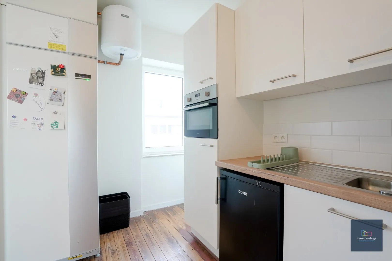 Het appartement is gelegen op de 1ste verdieping van een aangename residentie met vooral jonge werkende bewoners. Indeling als volgt; inkomhal, afzondelijk toilet, badkamer met douche en lavabo, lichtrijke living met open keuken en 1 zeer ruime slaapkamer. Kelder aanwezig.