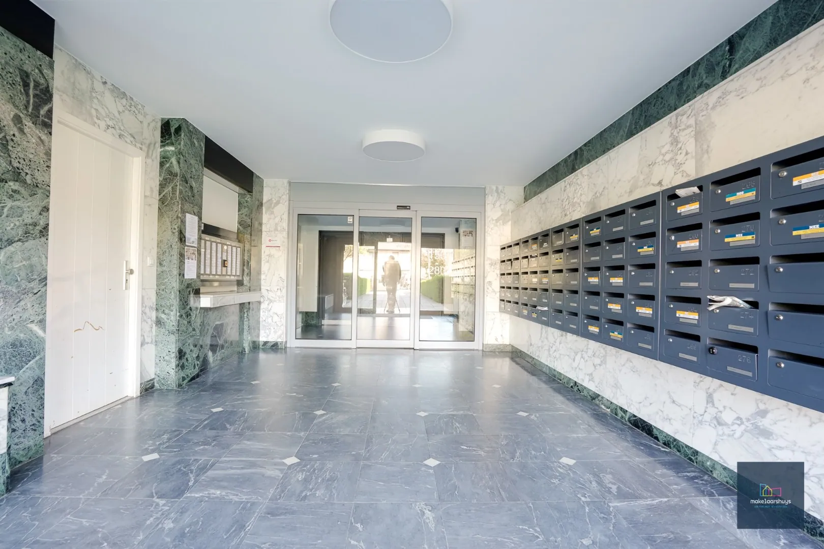 Een verzorgde algemene inkomhal met brievenbussen, sas, lift en traphal.