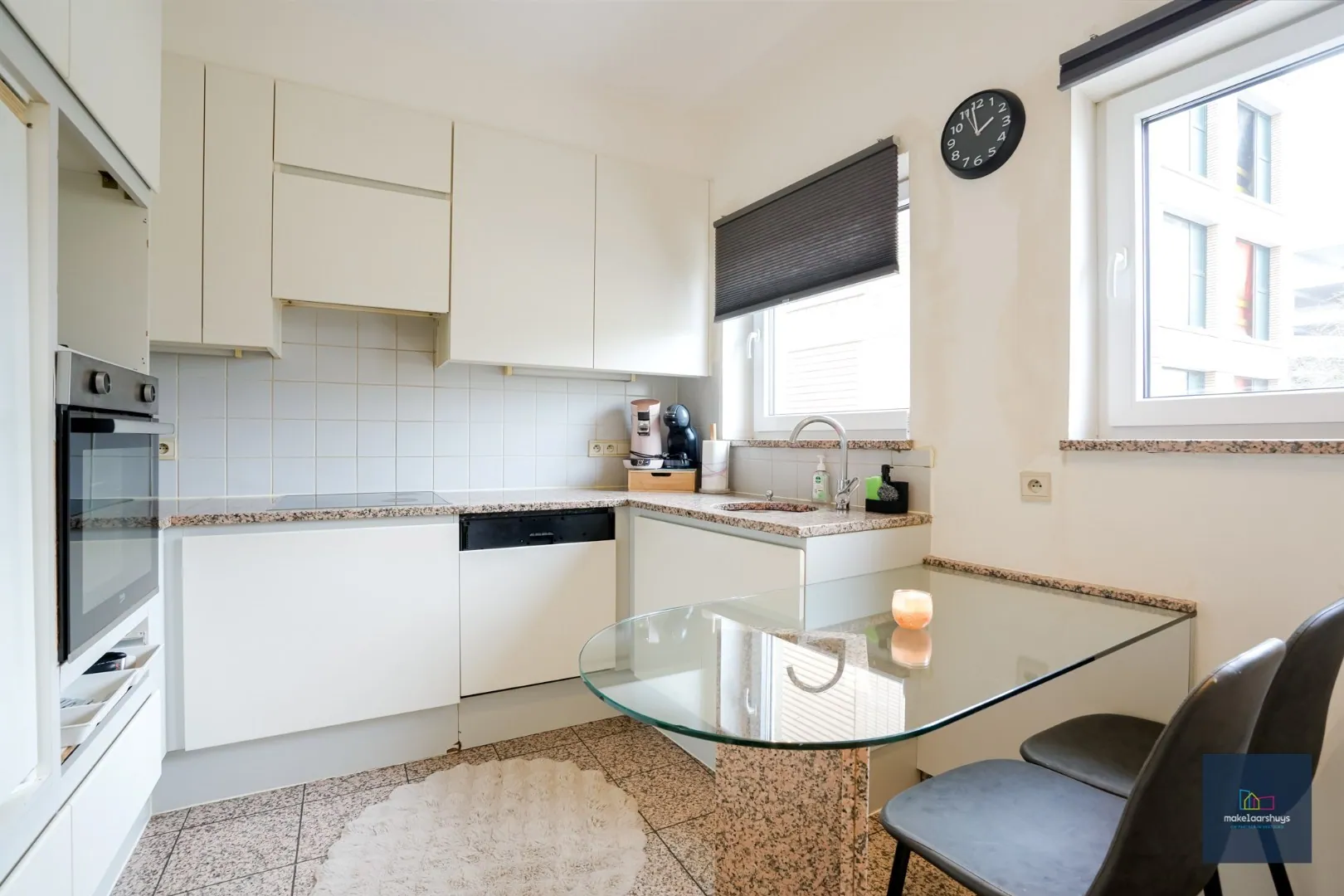 Aansluitend bevindt zich de praktische, gesloten keuken, volledig uitgerust met de nodige toestellen.