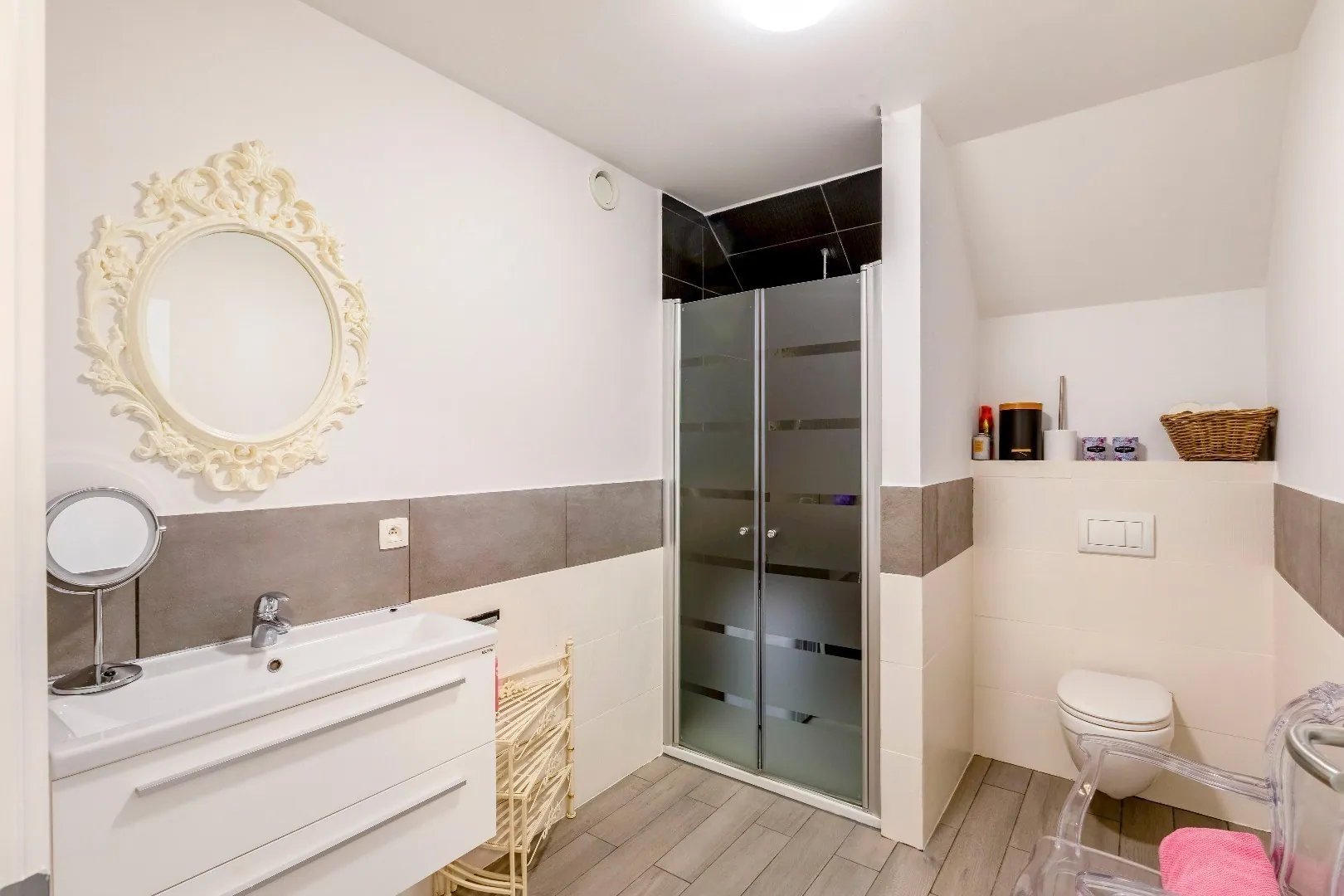 badkamer met douche, lavabo en toilet.