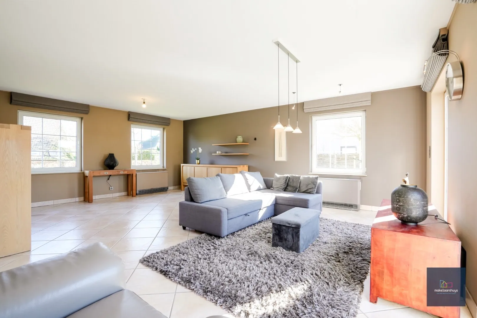 Via de inkomhal met gastentoilet betreedt u de lichtrijke leefruimte met grote raampartijen en een aangenaam zicht op zowel de straat als de tuin. De gesloten, volledig ingerichte keuken beschikt over de nodige toestellen en voldoende werk- en bergruimte. Aansluitend bevindt zich een ruime berging met toegang tot de carport en de dubbele garage, wat zorgt voor bijzonder veel praktische opbergruimte en parkeermogelijkheden.