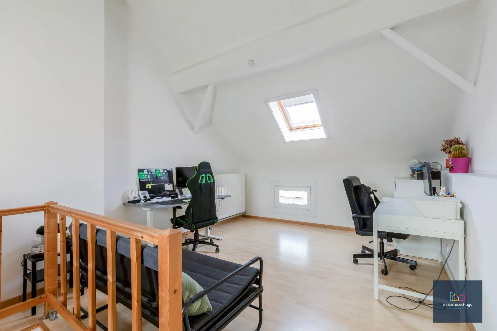Op de verdieping vinden we een slaapkamer met authentiek plafond terug en tevens een 2de kamer die als kinderkamer, dressing of bureau kan dienen. De zolderverdieping is afgewerkt en biedt plaats voor een ruime extra kamer of home office.