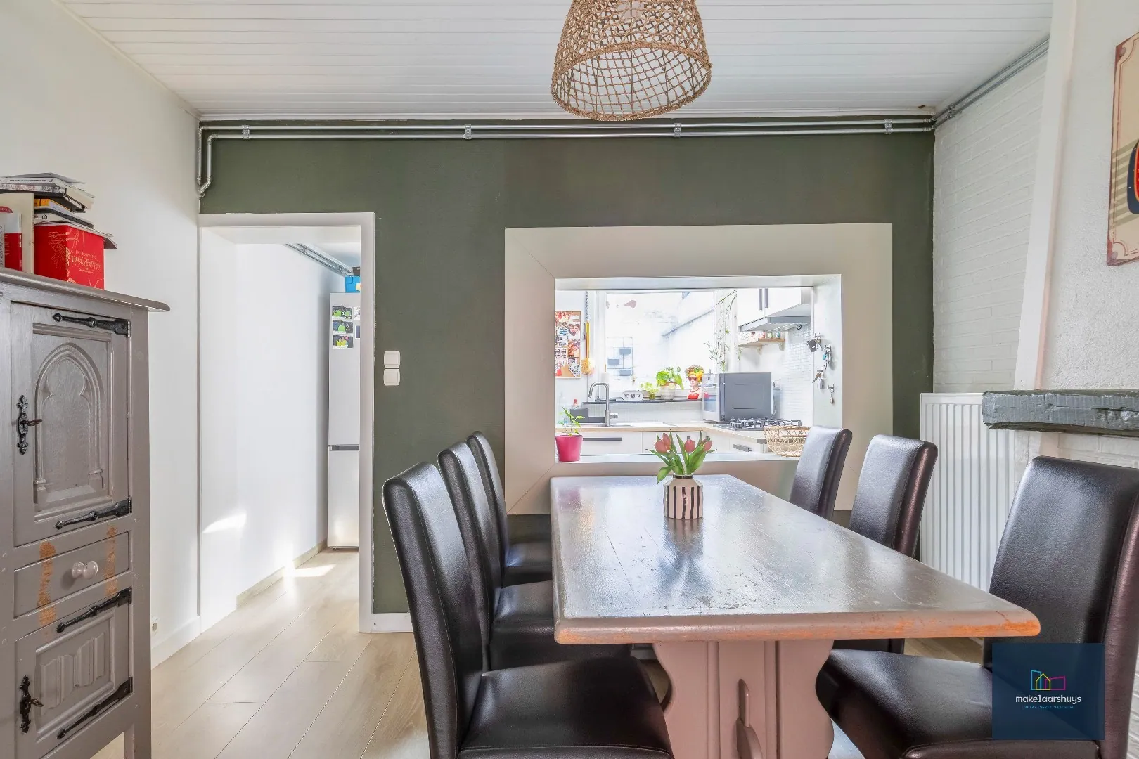 Bij het binnenkomen kom je terecht in de knusse leefruimte met zithoek en eetplaats. De houten vloeren en lichte muren zorgen voor een warme en huiselijke sfeer. De open keuken sluit naadloos aan en is uitgerust met kookplaat, oven en voldoende opbergruimte. Vanuit de keuken is er zicht op de eetkamer, wat zorgt voor een aangename connectie tussen de leefruimtes.