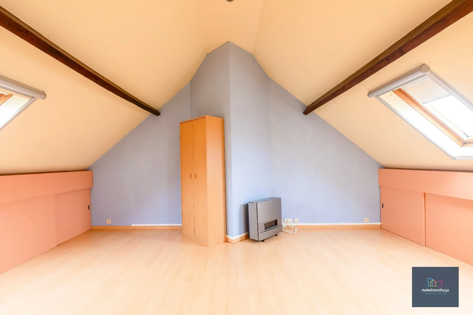 De woning is voorzien van een inkomhal, living en open keuken achteraan. Op het 1ste verdiep zijn er 2 ruime slaapkamers, een kleinere kamer/bureau en de badkamer. Het 2de verdiep is volledig ingericht als kamer met ingemaakte kasten.