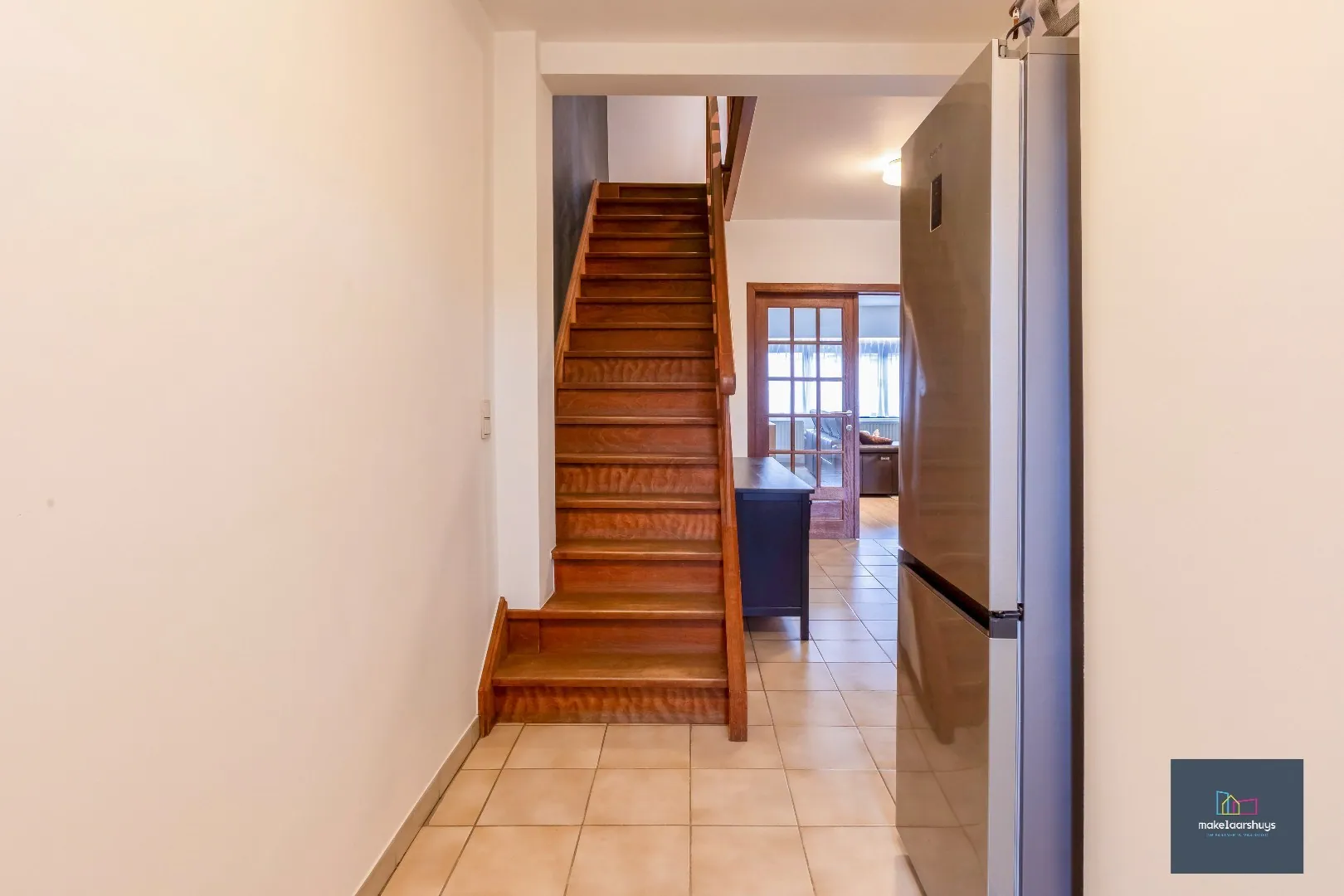 De zeer ruime woning omvat 191m² . Op het gelijkvloers heeft u de gemeenschappelijke hal rechts met kapsalon Krea's styling . Op het einde van deze hal is er een privatieve inkomdeur naar de privé traphal met opbergruimte.