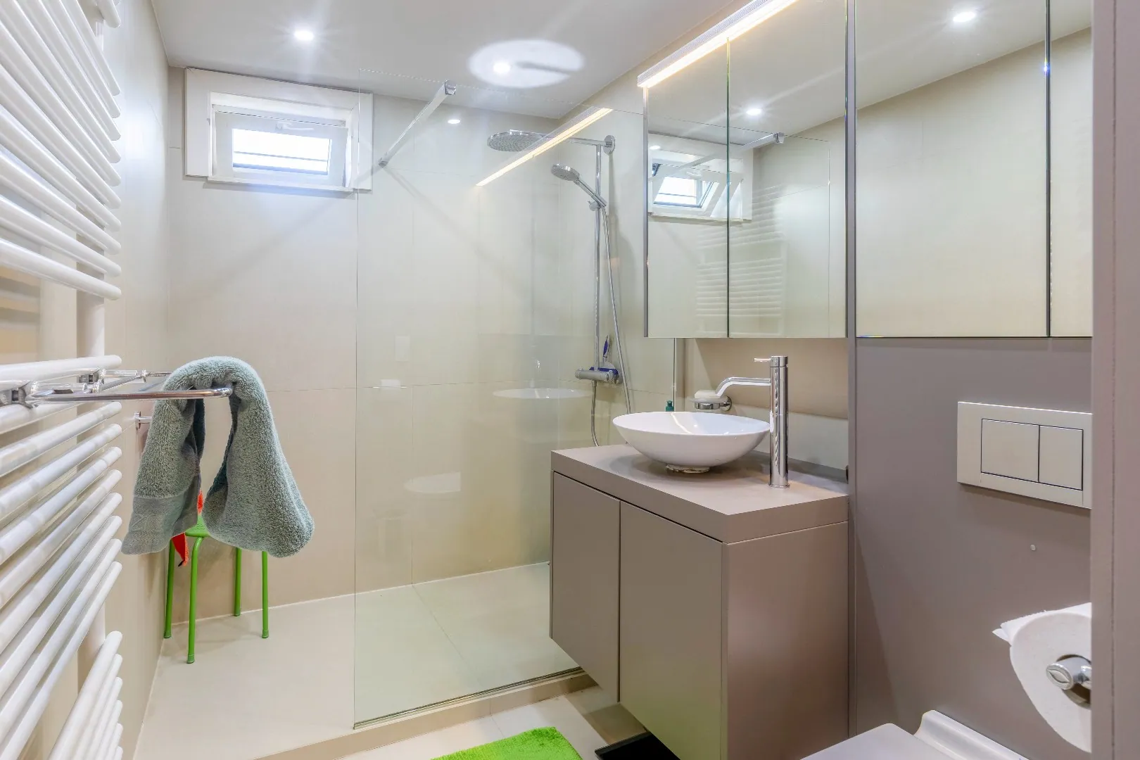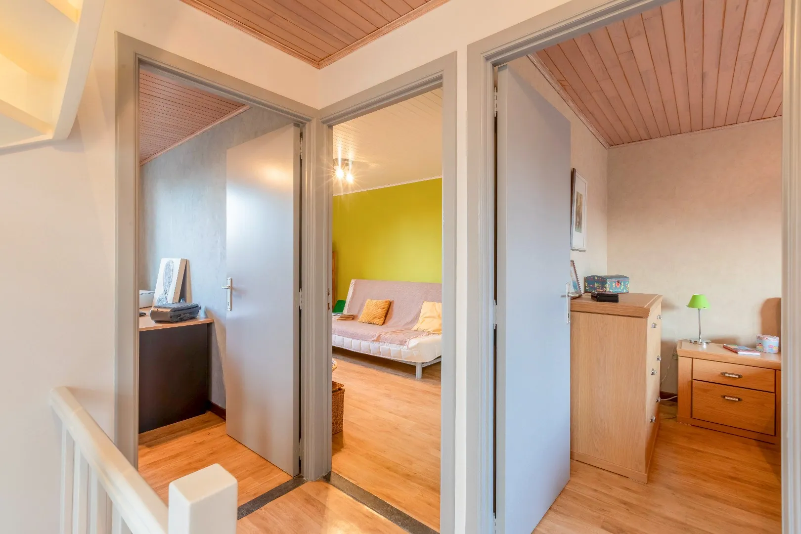 Via de trap bereikt u het 1ste verdiep met 3 slaapkamers en een vernieuwde badkamer met design inloopdouche , een wastafel en een apart toilet.
